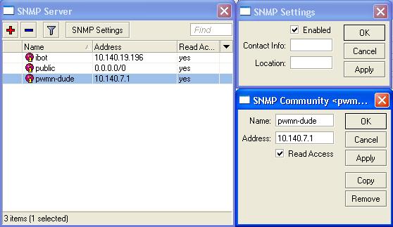 Για να φανουν οι router που διαχειριζεστε στον χαρτη πρεπει να προστεθει σε καθε router το pwmn-dude στα IP->SNMP->communities οπως ακριβως τα δυο παρακατω screenshots.